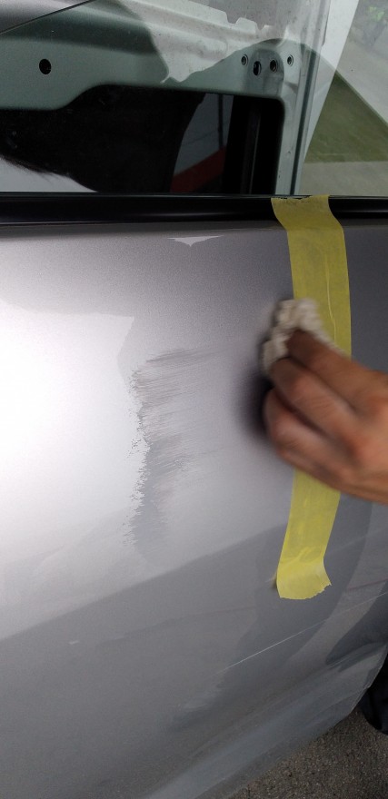 色が反射する色なので、右半分テーピングをして手磨きする所としない所との差が解るために