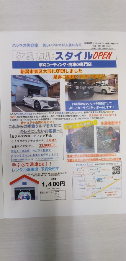 さらに3種類のメニューの1つをご注文いただいたお客様には+1000円でッオプションのケミスタジオ撥水保護コートをサービスしております!(2021年10月末までのキャンペーン)しかも今年6月からレンタル洗車場をオープン!!