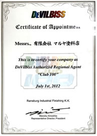 弊社では、デビルビスのスプレーガンを修理、メンテナンスするための資格を取得 しております。常に最適な状態で塗装ができるよう、安心の技術と真心でサポート いたします。