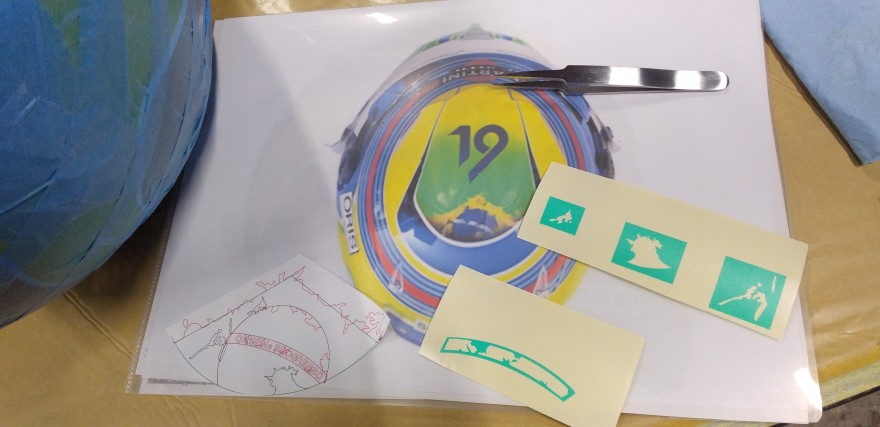 元々はドイツ製のヘルメットをアライ製のヘルメットへ塗装をするため寸法やらデザインのカッティングまで写真をみながら作成~(かなり大変な作業だと思います(゚Д゚))