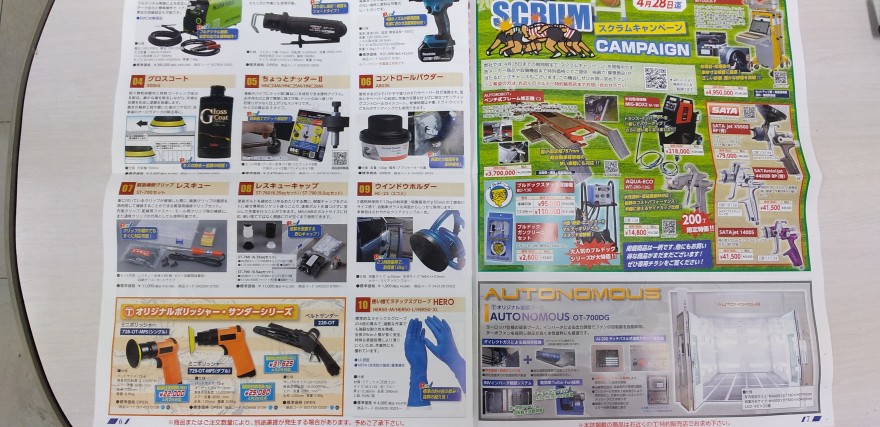 特に車両用製品では、ベンチ式フレーム修正機(オートロボット)、半自動溶接機MIG-BOX2(栄和製)、また水性塗料用高粘度塗料対応スプレーガン(アネスト岩田製)そして