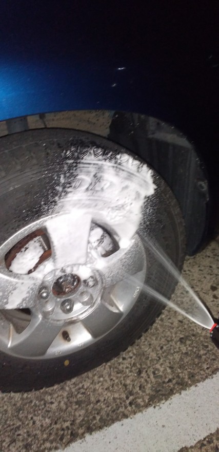 ゴム手袋していても、きつい作業ですが、これであったら、片手でムース状の泡をタイヤや