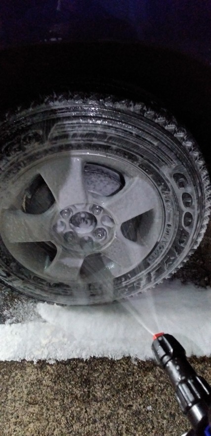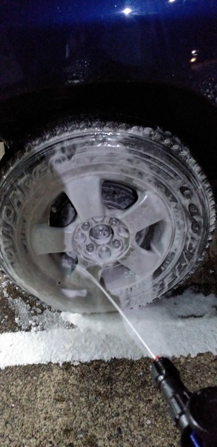安い洗剤でも、垂れはしますが、タイヤ周りは泡だらけになります。
