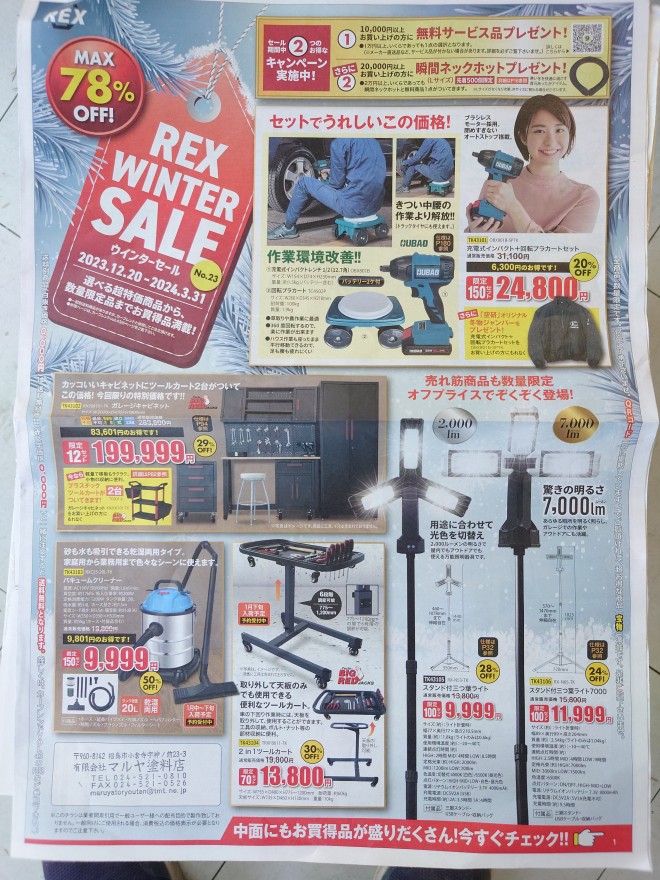 限定充電式インパクレンチ製品(150セット)をはじめバキュームクリーナー、作業用ライト(LEDタイプ)の2種類など、限定販売品や裏面の、A枠の商品をご購入すれば、B枠の商品を3種類だけ特売価格でご購入できるキャンペーンとなっております!!