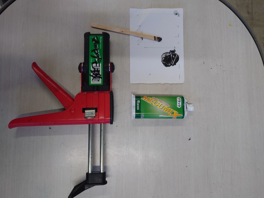 裂けているところを中心に、黒のメグミックスを良く混ぜて、練り練りしながら元々接着面に充填をして、乾燥を待ってみることにしました。