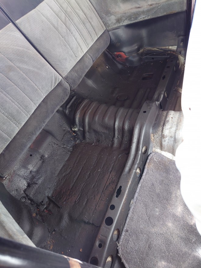 1番気になるリヤシート床の部分は、先ほどの工程同様FRP樹脂を何層にも重ね、アンダーコートブラックをスプレーをし、湿気、錆対策をしてました。