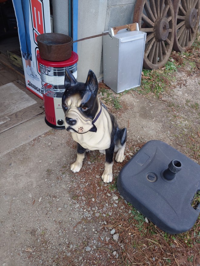 犬の模型の奥にラーメン屋さんが使っている入れ物や、隣には、赤い古いストーブもあり、