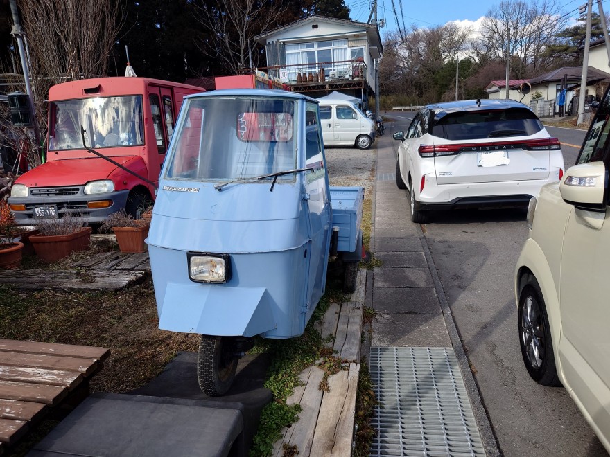 表には、水色の一人用の車が有り、良く覗いてみたら、ベスパ(バイク)のカウル仕様であり