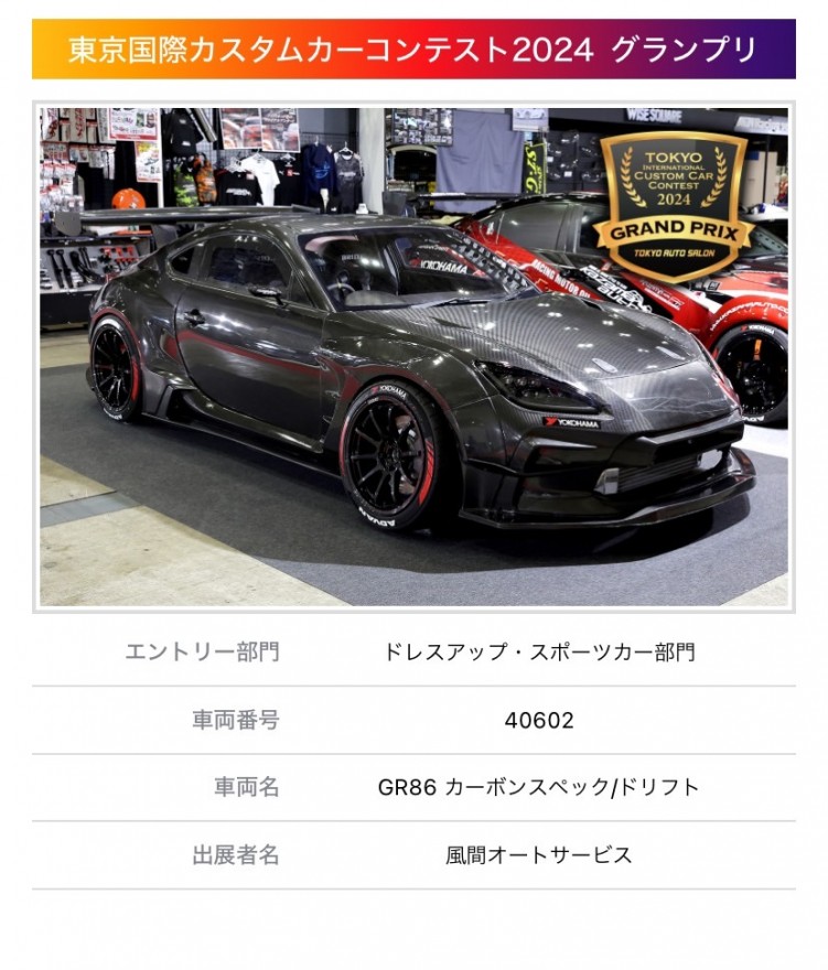 とうとう、弊社お客様が、2024年オートサロンに出品しましたGR86車が、東京国際カスタムカーコンテスト2024にて、コンセプトカー部門にて、最優秀賞を獲得致しました~