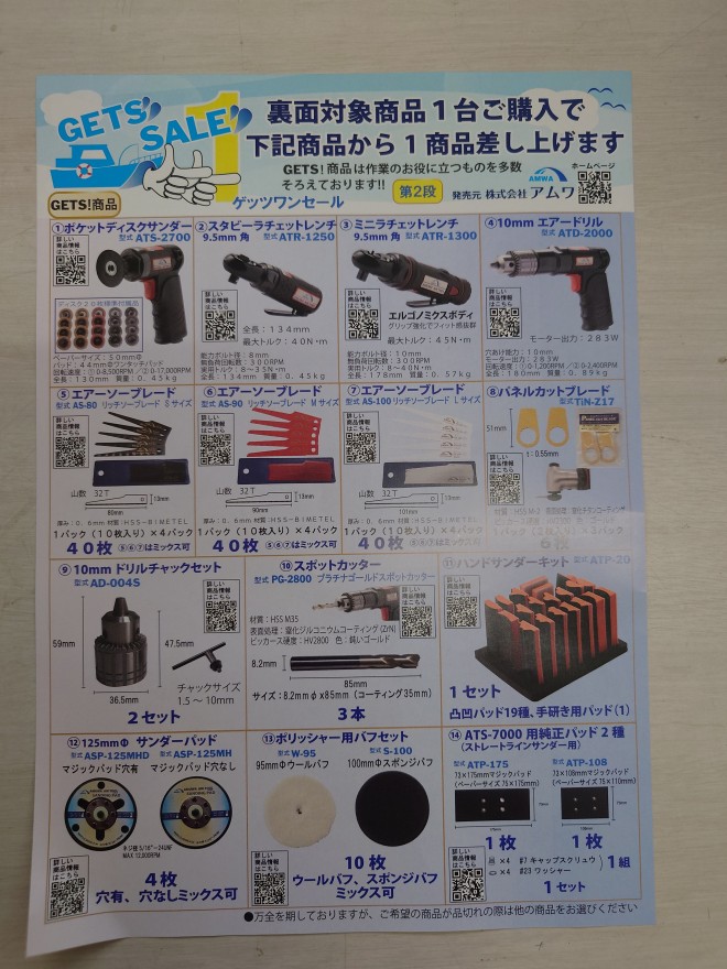 特に、新製品はありませんが、日常に使用する工具が沢山あり、整備工場様でも使用する工具が多いと思いますので、良いキャンペーンだと思います!