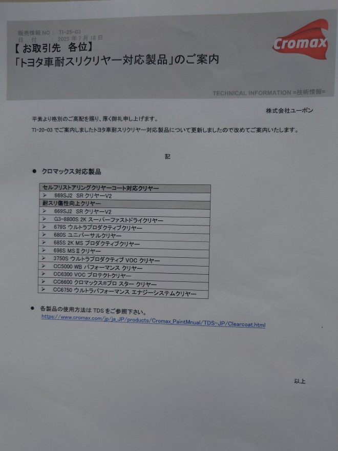 お疲れ様です。この度cromax製品のTOYOTA車による耐スリクリヤー対応製品のご案内になります。
